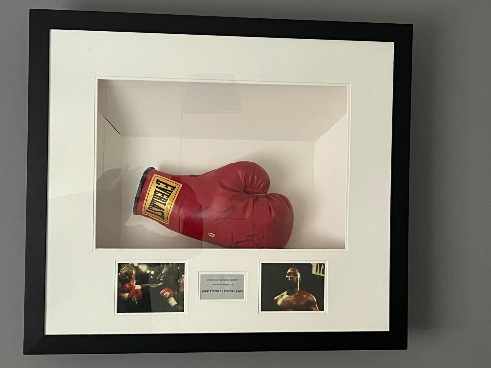 Framed boxing glove signed by Mike Tyson and Lennox Lewis.